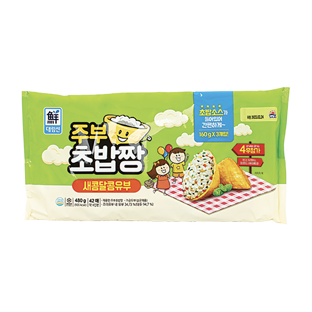 *Fried bean curd - Soybean, Seasoning liquid (Fructose, Water, Sugar, Soy sauce, Vinegar, Starch syrup), Soybean oil, Magnesium chloride, Calcium chloride, Lecithin, Calcium carbonate * Vinegar sauce - Vinegar, Sugar, Salt, Citric acid, Glycine *Flake - Sesame, Egg flake, Starch, Wheat flour, Black sesame, Carrot, Green onion