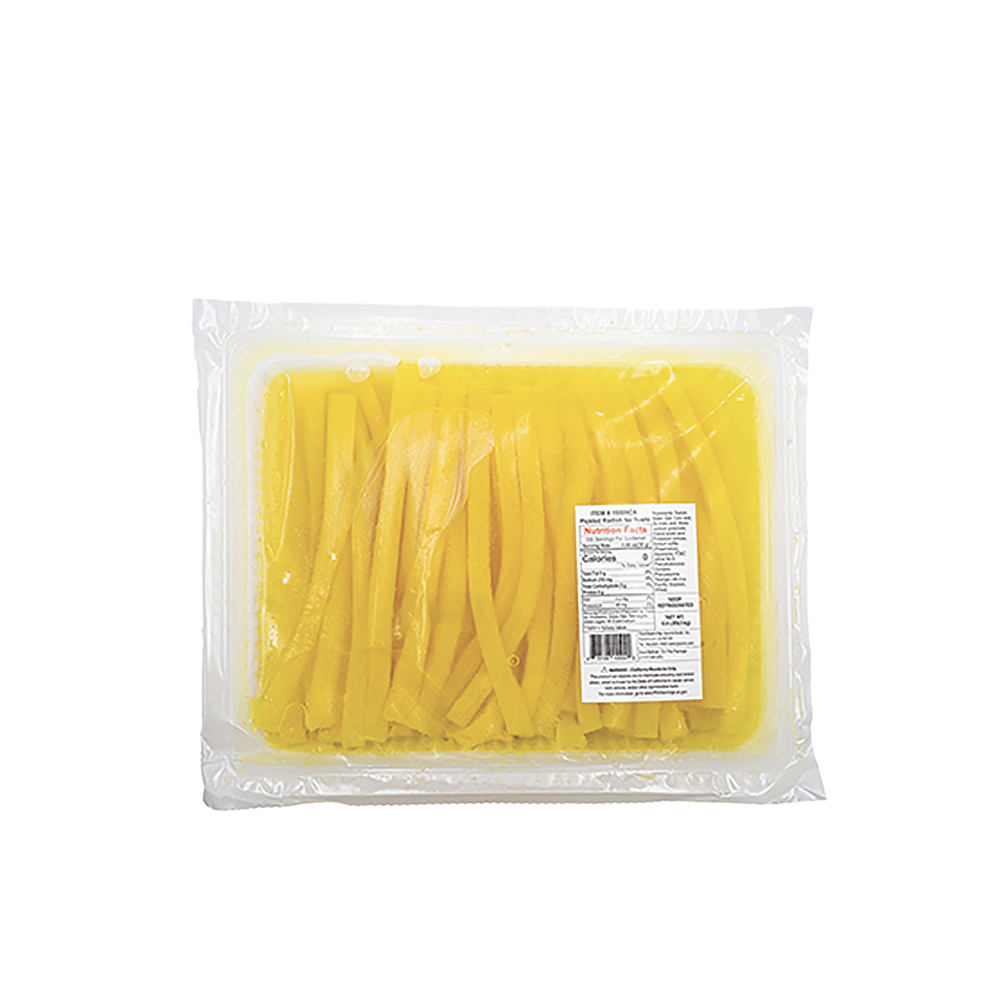 Salted radish(Radish, Salt), Water, Vinegar, Citric acid, Sugar, FD&C Yellow No.5, Monosodium glutamate, Sodium bisulfite(Preservative)