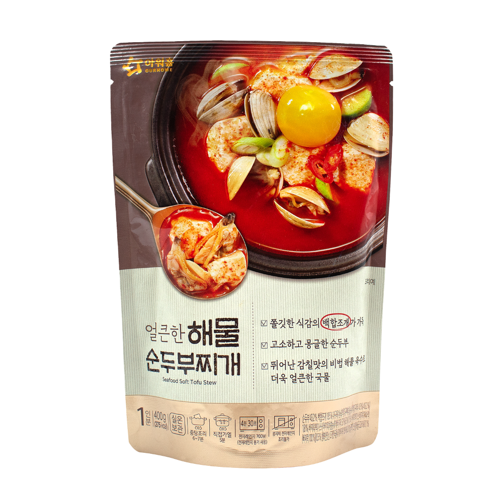 Tofu(Soybean, Glucono Delta-Lactone, Soybean Oil, Glycerol Esters of Fatty Acids, Soybean Lecithin, Magnesium Carbonate), Water, White Clam, Seasoning Sauce(Rice Bran Oil, Red Chili Powder, Garlic, Wheat Flour, Salt), Seasoned Clam Extract(Clam Concentrate, Corn Syrup, Disodium 5'-Ribonucleotides), Cod Broth Extract(Cod Concentrate , Dextrin, Corn Syrup, Salt, Disodium 5'-Ribonucleotides), Red Chili, Clam Extract, Pollack Broth(Pollack Extract, Salt, Dextrin, Xanthan Gum), Red Chili Powder, Clam Broth(Clam Extract, Salt, Clam Extract Powder, Monosodium Glutamate, Maltodextrin, Disodium Succinate, DL-Methionine, Kelp Concentrate Powder, Garlic Powder, Onion Powder, Tuna Extract Powder, Shiitake Mushroom Extract Powder, Soybean Oil, Citric Acid, Silicon Dioxide, Disodium 5'-Ribonucleotides, White Pepper Powder), Disodium 5'-Ribonucleotides, Oyster Extract Powder(Oyster, Maltodextrin, Salt, Shrimp Extract, Glycine, Disodium Succinate, Disodium 5'-Ribonucleotides), Yeast Extract, Yeast, Sugar